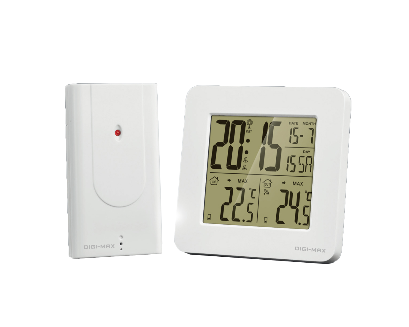 | Description | LCD size: 63 x 61 mm Radio controlled with DCF, WWVB or MSF Time, calendar display Alarm and snooze function Indoor & outdoor temperature (with C/F selectable) with trend Memory for max./min. temp. Backlight Low power indication Power by 2 x AA batteries for main unit 2 x AA batteries for outdoor sensor |