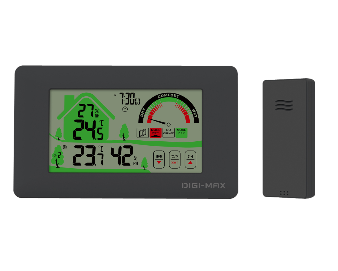 | Description | LCD size: 76 x 34 mm Radio controlled with DCF, WWVB or MSF Alarm and snooze function Touch button for operation Indoor & outdoor temperature (with C/F selectable) and humidity Comfortable level indication Window open or closed indication White backlight Power by 2 x AAA batteries |